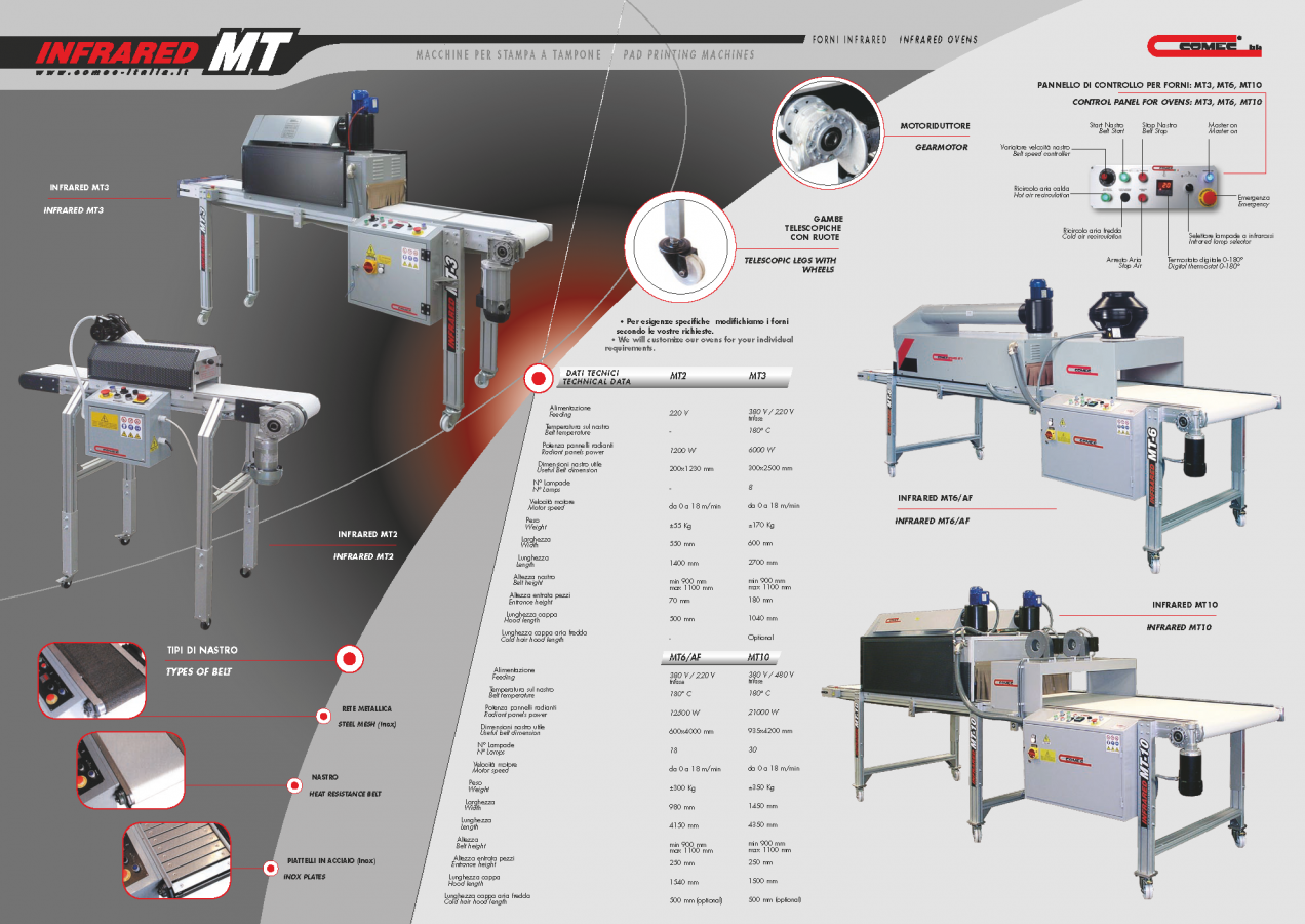 For better and faster drying of printed surfaces the ideal device is an oven of the INFRARED MT series of Comec Italia. Available in varying dimensions from the “small” MT2 to the capacious MT10, passing through the versatile MT3 and MT6, it works with infrared ceramic lamps, that can be combined with the forced circulation of hot air *. Both systems can then work separately. An electronic thermostat allows you to control the temperature.